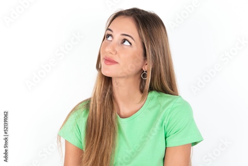 young beautiful woman wearing green T-shirt over white background looking aside into empty space thoughtful