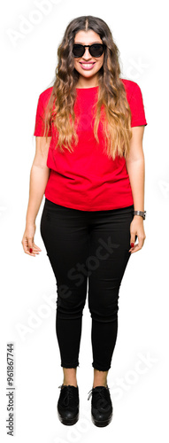 woman, girl, young, indian, arab, hispanic, portrait, isolated, background, adult, beautiful, attractive, model, fashion, casual attire, t-shirt, red, sunglasses, smiling, happy, smile, cheerful, looking, face, positive, happiness, lifestyle, confident, business, cool, confidence, success, joy, person, laugh, laughing, style, natural, honed, teeth, mouth, trust, proud, front, excited