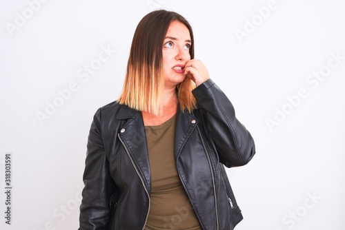 Young beautiful woman wearing t-shirt and jacket standing over isolated white background looking stressed and nervous with hands on mouth biting nails. Anxiety problem.