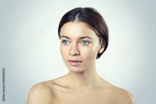 Young beautiful woman with bare shoulders, beauty portrait on a light background