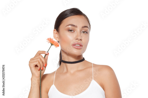 portrait, girl, face, female, flower, white, skin, young, beauty, beautiful, isolated, adult, hair, woman, model, person, spa, sexy, pretty, background, care, make-up, fashion, attractive, joy, lady, happy, studio, health, cosmetic, caucasian, brunette, fresh, clean, aroma, happiness, smiling, teeth, natural, skincare, space, spring, pampering, wellness, people, head, sensuality, purity, summer, hand