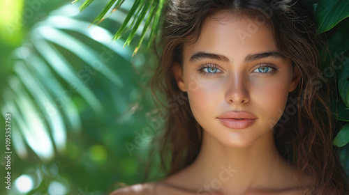 Young beautiful woman with healthy skin of face and palm leaves. Closeup fresh face of an attractive caucasian girl with green plants. Model with bright brown eye makeup. Skin care concept.