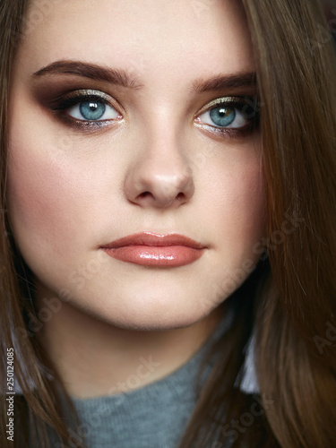 attractive, beautiful, beauty, face, fashion, female, girl, glamour, lip, make-up, portrait, young, background, cute, elegance, eye, coiffure, model, skin, brown, cosmetic, eyebrow, facial, head, shiny, woman, hair, sexy, colours, colourful, dark, fashionable, lipstick, constructed, passion, shine, blue, reddening, highlighter, glossy, natural, emotional, 20s, closeup, earring, caucasian, brush, sweater, grey