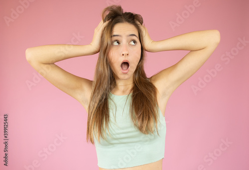 Young beautiful woman with straw hat feeling horrified and shocked, raising hands to head and panicking at a mistake against pink wall