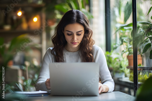 Young beautiful woman working laptop a modern workspace