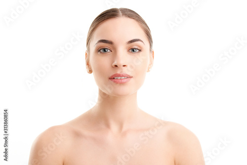 beauty, woman, face, portrait, missy, woman, brunette, make-up, skin, skincare, female, caucasian, flawless, isolated, white background, studio shot, 20s, 30s, attractive, beautiful, graceful, lady, smile, open mouth