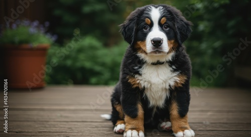 Young Bernese Mountain Dog puppy sitting on a wooden deck in a garden