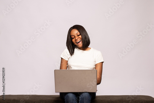 african, africa, black, nigeria, woman, lady, female, girl, young, person, beautiful, pretty, gorgeous, fine, cute, youth, adult, lifestyle, laptop, computer, technology, browsing, information, communication, device, using, copy space, white background, online, cyberspace, portrait, tech, cheerful, happy, delighted, excited, exciting, excitement, fun, laughing, laughter