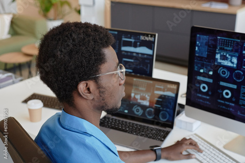 Young black man in eyeglasses looking at graphs and charts on computer screens while sitting by workplace in office and analyzing data