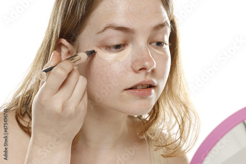 cosmetic, woman, eye, foundation, cream, applying, correction, make-up, under, make-up, tone, caucasian, skin, brush, skincare, beauty, female, face, portrait, young, attractive, natural, model, isolated, treatment, visage, cosmetology, pretty, beautiful, care, circle, facial, perfection, wellness, apply, preparation, closeup, white background, complexion, constructed, routine, up, coverage, closeup, liquid, product, applicator, smooth