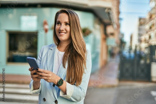 Young blonde businesswoman smiling happy using smartphone at the city.