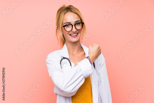 Young blonde doctor woman celebrating a victory