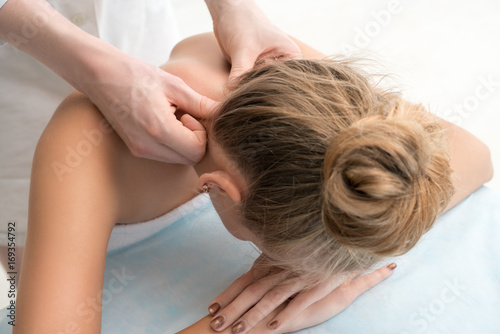 Young blonde enjoying neck massage in saloon