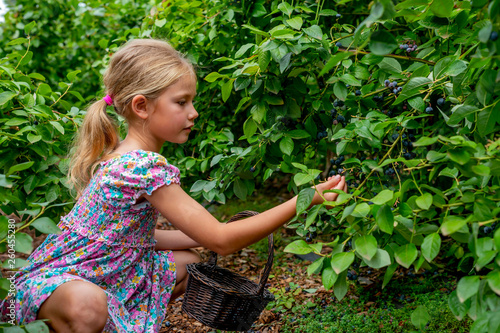 young blonde girl picking blueberries