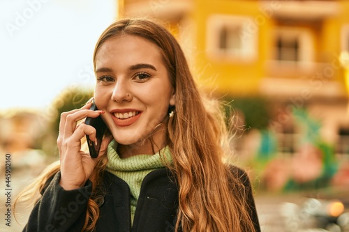 Young blonde girl smiling happy talking on the smartphone at the city.