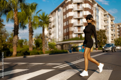 fashion, urban, model, street, summer, girl, stylish, sporty, dress, spring, modern, power, woman, walk, traffic, city, sexy, outfit, shoe, vogue, sneaker, sport, body, activewear, blond, long hair, fashionable, luxury, elegance, trendy, motion, chic, sunglasses, black, boot, beautiful, attractive, haute couture, high, young, catwalk, active, leg, move, crosswalk, dynamic, cool, lifestyle