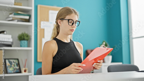 young, caucasian, woman, female, person, portrait, adult, beautiful, blond, attractive, business, professional, work, men at work, working, success, manager, boss, employee, elegant, job, goggles, sitting, table, desk, serious, relaxed, condensed, read, reading, document, paperwork, paper, clipboard, checklist, office, workplace, indoor, indoor, interior, room, background