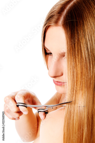 hair, scissors, girl, portrait, model, attractive, adult, female, care, person, beauty, beautiful, blond, coiffure, cutting, white, background, isolated, hand, happiness, coiffure, studio, people, styling, lady, young, woman, toothy smile, long, joy, skin, space, health, happy, cut, clean, head, fashion, cute, healthy, fresh