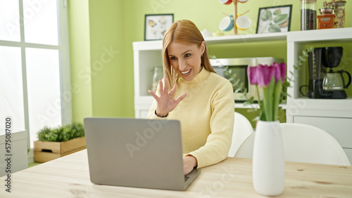 young, caucasian, woman, female, person, portrait, adult, beautiful, blond, attractive, sitting, table, comfortable, comfort, laptop, computer, working, contraption, device, using, cyberspace, online, technology, sunlight, flower, plant, jar, pot, smiling, confident, smile, happy, conference, speaking, talking, calling, speak, conversation, home, house, apartment, indoor, indoor, interior, living room, room, background