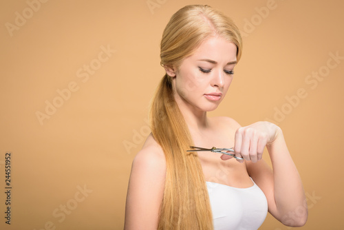 young blonde woman holding scissors and cutting long hair isolated on beige