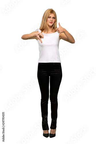 Young blonde woman making good-bad sign. Undecided between yes or not over isolated white background