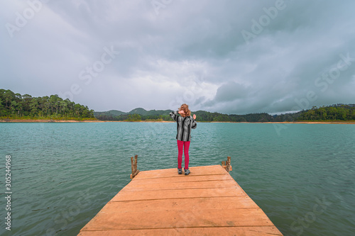Young blonde woman on a pier watching a turquoise lake and background mountains with forest