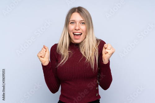 Young blonde woman over isolated blue background celebrating a victory in winner position