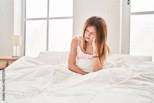 Young blonde woman stressed sitting on bed at bedroom