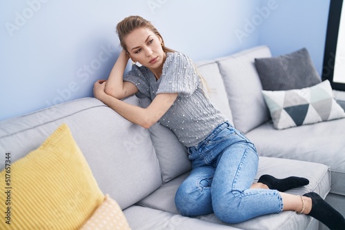 young, blond, caucasian, woman, female, adult, person, beautiful, attractive, pretty, looking, cool, lifestyle, expression, sitting, sofa, sunlight, relaxed, relaxation, depression, problem, sad, unhappy, depressed, alone, stress, stressed, trouble, upset, frustrated, sorrowful, anxiety, despair, mental, cephalalgia, ache, crisis, frustration, conflict, emotion, home, house, apartment, indoor, indoor, interior, living room, room, background