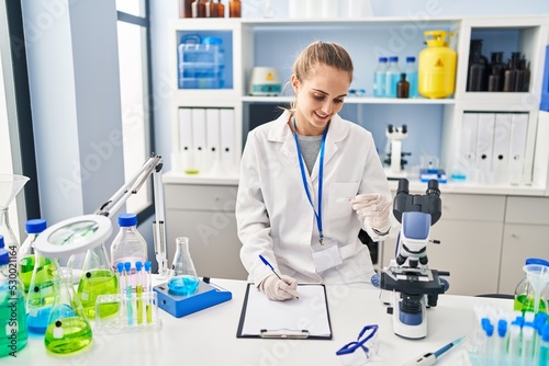 Young blonde woman wearing scientist uniform writing on checklist at laboratory