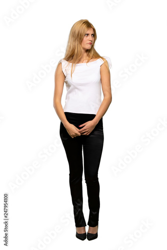 Young blonde woman with confuse face expression while bites lip over isolated white background