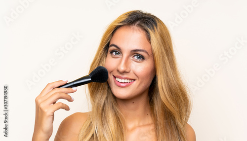 Young blonde woman with makeup brush
