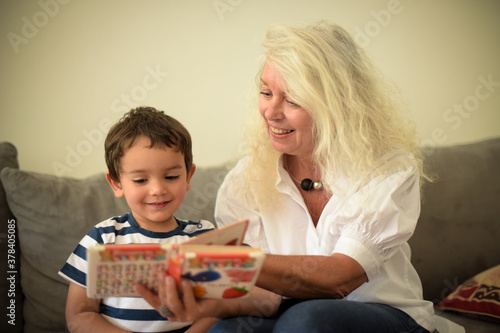 grandmother, woman, boy, caucasian, children, senior, white hair, shirt, reading, retirement, lifestyle, home, family