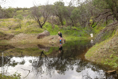 Young boy catching tadpoles in natural waterhole