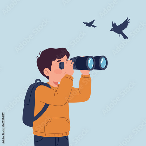 boy, binocular, bird, nature, observation, curiosity, adventure, children, sweater, backpack, flying, wildlife, exploration, vector, flat, digital, art, design, seeing, sky, playful, activity, environment, excitement, fun, hobby, learning, interest, landscape, leisure, youth, scenery, bright, cheerful, scene, peaceful, engaging, colourful, graphic, creative, simple, cartoon, illustration