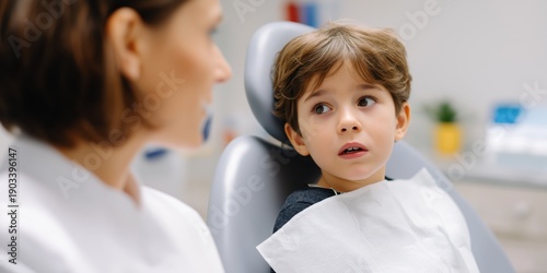 boy, dentist, dental, check-up, concerned, children, health care, clinic, professional, indoor, medicals, exam, treatment, smiling, woman, support, attention, discipline, health, trust, confidence, relaxation, interaction, pediatric, doctor, conversation, mouth, sitting, patient, life events, routine, concern, young, advice, guidance, preparation, clean, oral, hygiene, respect, appointment, human relationships, comfort, friendly, assistance