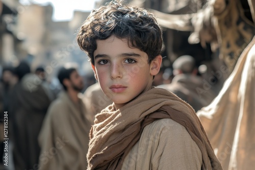 boy, children, curl, market, ancient city, daytime, curious, clothing, crowd, historical, bustling, people, portrait, culture, street, gaze, heritage, traditional, youth, exploration, community, interaction, personality, expression, atmosphere, scenery, warm tones, adventure, tradition, localization, casual attire, seller, sight, discovery, nature, youthfulness, innocence