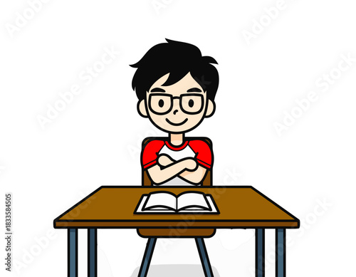 boy, children, student, school, education, learning, goggles, desk, book, reading, sitting, indoor, young, children, classroom, study, cognition, academic, focused, intelligent, clever, person, male, youth, asian, cartoon, illustration, drawing, simple, red, white, shirt, portrait, cute, cheerful, happy, back to school, curious, observant