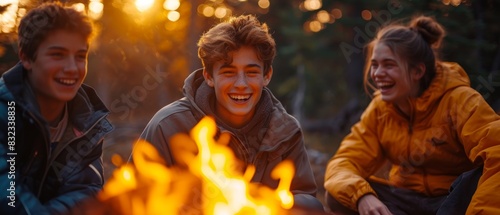 young boys and girls with friends, group of teens laughing around a campfire