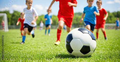 young boys running, in motion, playing soccer on a green grass field