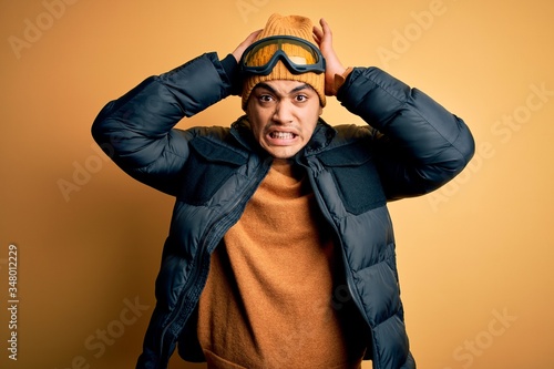 Young brazilian skier man wearing snow sportswear and ski goggles over yellow background Crazy and scared with hands on head, afraid and surprised of shock with open mouth