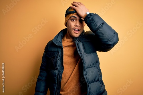 Young brazilian skier man wearing snow sportswear and ski goggles over yellow background surprised with hand on head for mistake, remember error. Forgot, bad memory concept.