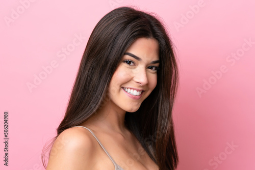 girl, woman, people, person, female, woman, lady, attractive, beauty, pretty, beautiful, youth, young, adult, brunette, brazilian, latin, hair, 1, background, isolated, wall, colours, colourful, pink, care, clean, cute, elegance, face, fresh, glamour, health, healthy, portrait, skin, happy, laugh, laughing, smile, happiness, expression
