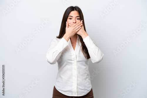 Young Brazilian woman isolated on white background covering mouth with hands