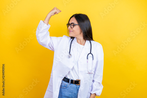 Young brunette doctor woman wearing stethoscope standing over isolated yellow background showing arms muscles smiling proud