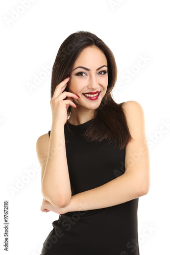 Young brunette woman in black dress on a white background