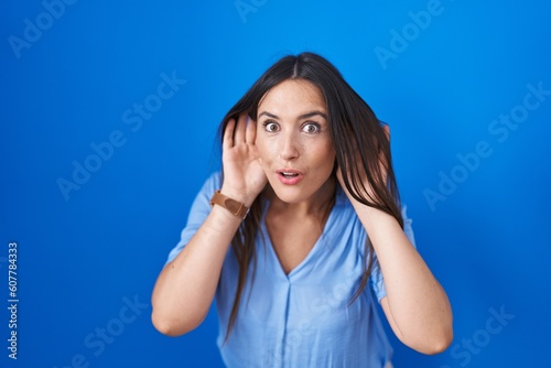 Young brunette woman standing over blue background trying to hear both hands on ear gesture, curious for gossip. hearing problem, deaf