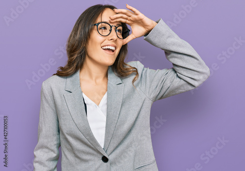 Young brunette woman wearing business clothes very happy and smiling looking far away with hand over head. searching concept.