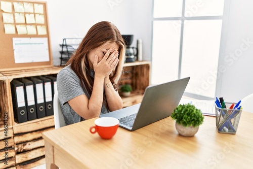 Young brunette woman working at the office with laptop with sad expression covering face with hands while crying. depression concept.