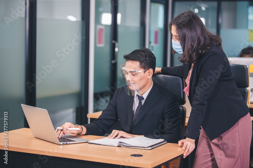 young business with face mask work plan in the office. Businessman and businesswoman using a laptop together while standing in front of office